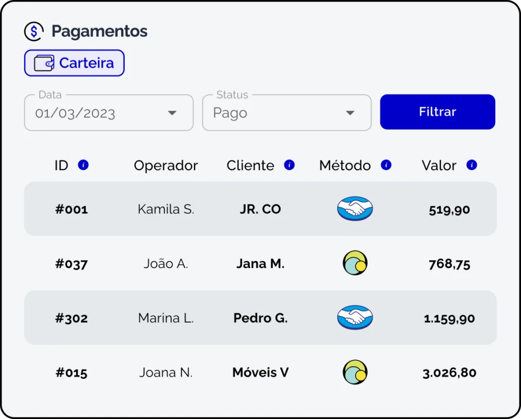 Filtre as informações das vendas pelo nome do cliente, por vendedor, por método de pagamento e por status de andamento do pagamento.